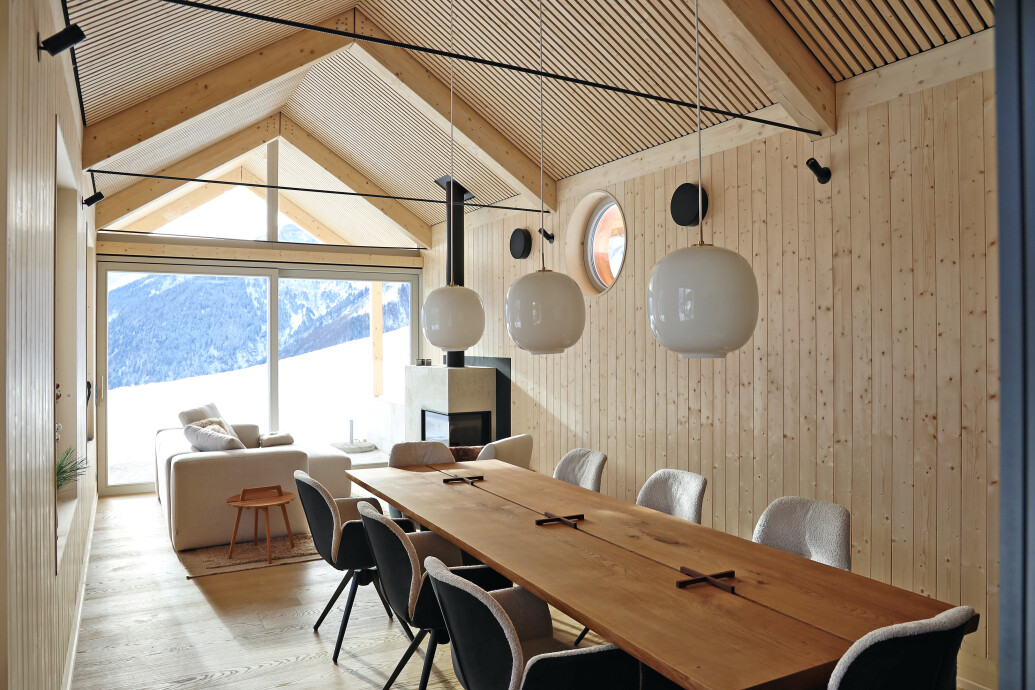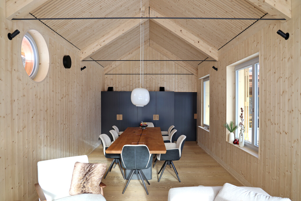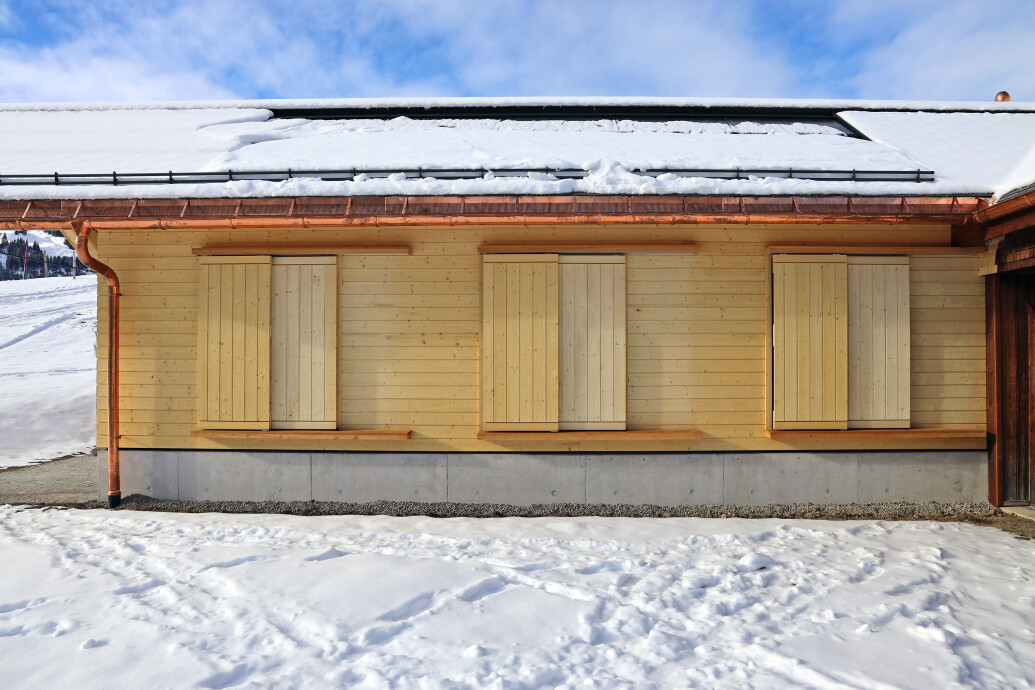 Der Innenraum ist hölzern ausgekleidet, unterschiedliche Fensteröffnungen reagieren auf die jeweilige Aussicht und Einbettung im Gelände. Die Fassade lässt sich mit Schiebeläden schliessen und verweist auf umgebende Landwirtschaftsbauten.